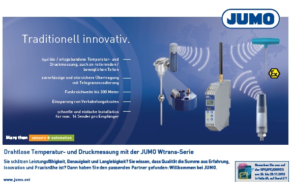 Die JUMO Lösungen zur drahtlosen Temperatur- und Druckmessung ermöglichen eine flexible, ortsgebundene Temperatur- und Druckmessung, auch an rotiereneden und beweglichen Teilen.