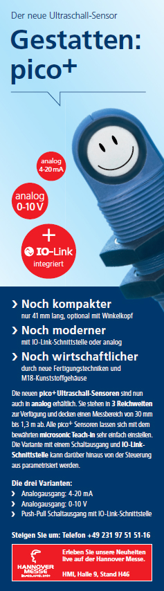 Mit vier verschiedenen Tastweiten decken die neuen pms Ultraschallsensoren einen breiten Messbereich von 20 mm bis 1,3 m ab. Die Sensoren sind mit einem Push-Pull-Schaltausgang und IO-Link in der Version 1.1 sowie mit Analogausgang 0-10 V und 4-20 mA verfügbar. Damit kann ein sehr breites Spektrum an unterschiedlichen Applikationen abgedeckt werden. Der Sensor ist in einem Temperaturbereich von – 25°C bis +70°C einsetzbar und verfügt über eineGenauigkeit von ± 1 % mit interner Kompensation der Temperaturdrift.