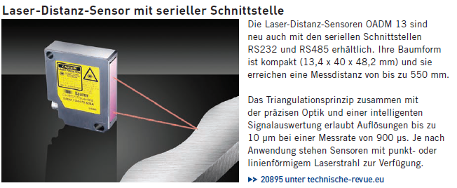 Laser-Distanz-Sensoren OADM 13 sind mit seriellen Schnittstellen RS232 und RS485 erhältllich; kompakte Bauform und Messdistanz bis zu 550mm.