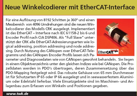 Die neuen Winkelcodierer des Modells CRK ist für eine Auflösung von 8192 Schritten je 360° und einen Messbereich von 4096 Umdrehungen ausgelegt.