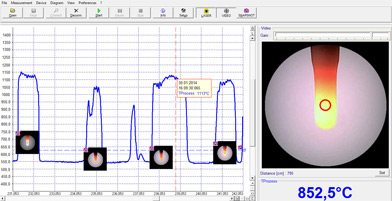 Das CSvideo 3M wird über ein Adapterkabel an eine USB-Schnittstelle am Laptop oder PC angeschlossen. Die darauf installierte Software Compact Connect stellt neben dem Temperatur-Zeit-Diagramm das Videobild der integrierten Kamera dar. Mit dem Drehknopf an der Rückseite lässt sich die Optik dann sehr einfach fokussieren und optimal auf das Messobjekt ausrichten. In der Software können auch alle weiteren Einstellungen vorgenommen werden. So kann beispielsweise der Emissionskoeffizient angepasst und das Ausgangssignal skaliert werden. Die Software stellt die aktuellen Messwerte grafisch dar und speichert diese zur Dokumentation bzw. nachträglichen Analyse ab.