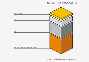 Der Schlüssel zu dieser hohen Qualität und hervorragenden Leistung liegt im Schichtaufbau: ECONIDUR Kontakte sind mit einer speziell entwickelten Nickel-Phosphor- (NiP-) Beschichtung versehen, die auf einer ausgeklügelten Schichtkonfiguration basiert.
